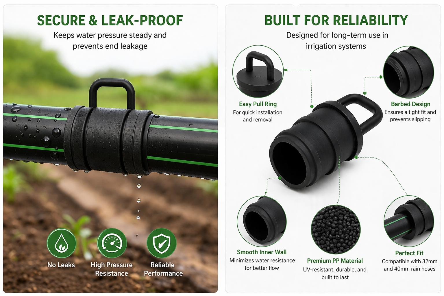 يعمل كغطاء محكم لنهاية الخرطوم، مما يمنع خروج المياه ويحافظ على كفاءة توزيع المياه داخل النظام.